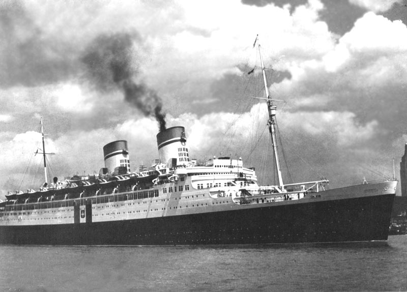 long and sleek Italian Liner SS Conte Di Savoia is seen berthed in