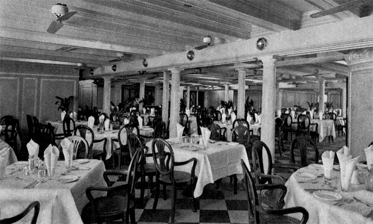 The Dining Saloon was located on Upper Deck directly aft of the forward Main Lobby. It certainly was a splendid venue being superbly furnished with the finest quality of furnishings, made of mahogany and elegant in style, as soon as one entered you would be assured that a fine meal awaited you as you were shown to your table by one of the polite and perfectly dressed stewards.