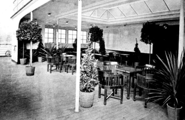 Just aft of the Smoking Room was the Verandah Café, for that outdoor view and a nice cup of tea, or coffee and a snack, etc.