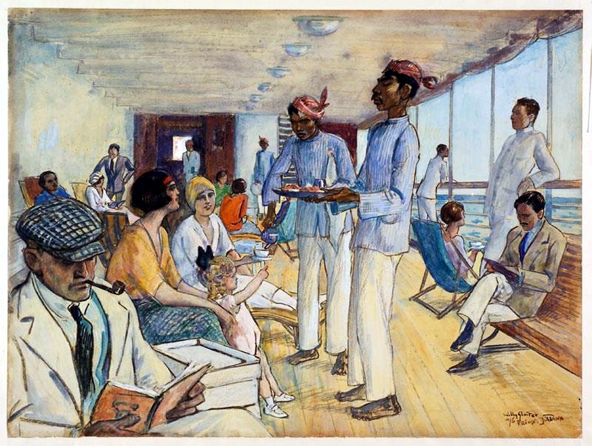 with an illustration of an afternoon tea being served on Promenade deck, with Javanese