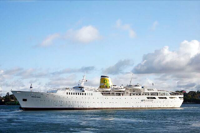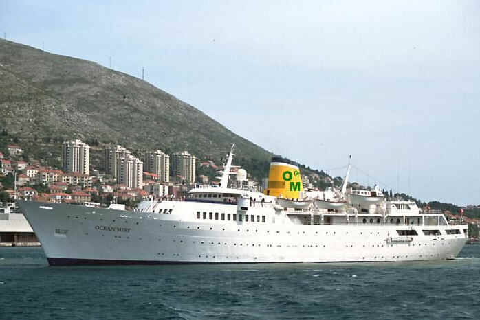 Ocean Mist is seen here without her lifeboats and tenders and her new funnel