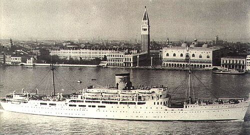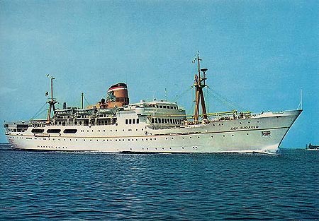 We already have the delightful Adriatica Lines Ausonia featured on ssMaritime, I felt to add several of the earlier (Post War) ships built by the company. However, this feature will highlight the delightful MS San Giorgio, which was until recently operated by the Swiss-owned African Safari Club under the name Royal Star. The ship’s current profile is quiet deceptive, for she certainly does not look her age. Since built, her three holds as well as her forward and aft A frame masts were removed with a new signal mast added atop her Bridge and a stylish mast aft of her funnel. In addition, her Promenade Deck was extended both forward and aft, making her an attractive modern looking ship indeed.