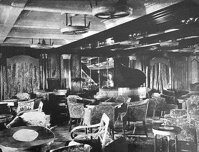 On this deck, commencing from far forward was the magnificent Social Hall (Music Salon) featuring exquisite timber carvings, the finest furnishings beautifully upholstered in fine brocades and fine silk drapes. This spacious venue was followed by a Writing Room on the portside and a Reading Room on the starboard side. Next was the Main Lobby with its Grand Timber Stairwell with its superb and stylish brass railings. Next came the elegant Smoking Room and its Bar located on the port side just aft, followed by the Verandah Café far aft.