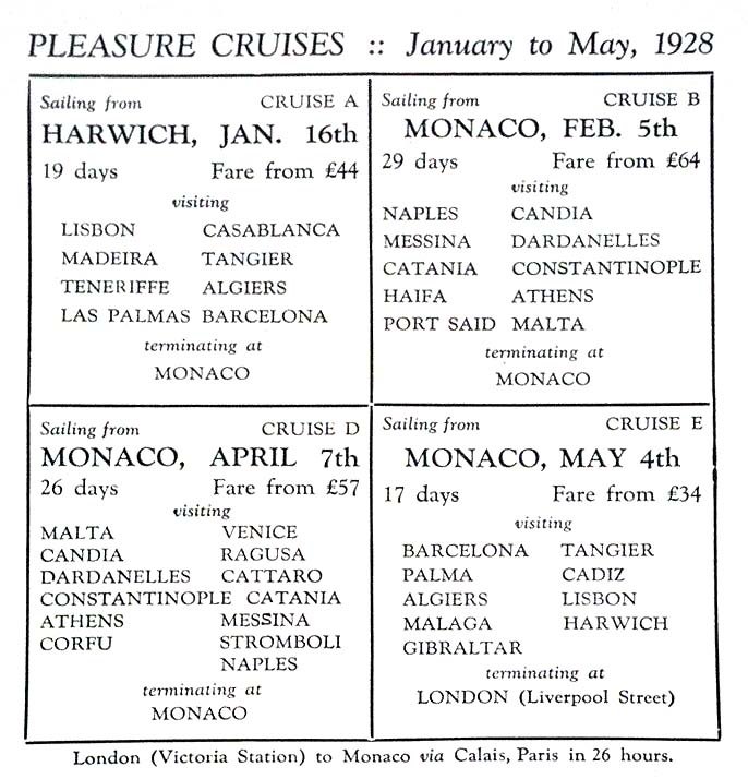 One deck down, forward on C-deck, was the location of the beautiful and elegant Grand Dining Room, which could seat 214 guests. C-deck also housed passenger cabins; noteworthy were the 4 deluxe Staterooms, all having two beds as well as having a sofa, which converted to a bed offering room for an additional guest. These Staterooms were designed with variety of fine timbers such as; mahogany, maple, pear and birch and all had Private facilities. In addition there were 70 twin and 50 single Staterooms. However, all the cabins were to be spacious and sumptuously fitted out, all accommodations featured lower beds, and hot and cold water, whilst 35 Staterooms had a full bathroom, as is stated on a promotional leaflet, as is seen below, featuring four cruises in 1928.