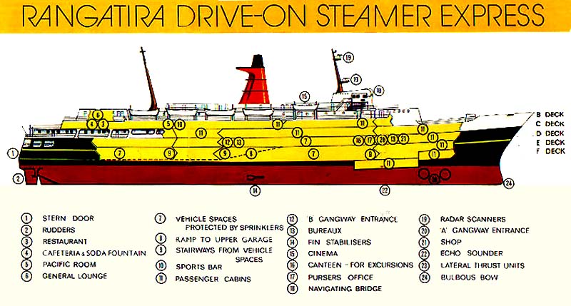 The Rangatira had a gross tonnage of 9,387 tons and a length of 500.4ft and there was no doubt that this new ship was superbly fitted out with some of the best facilities ever! Her public rooms were spacious, well-designed and featured attractive murals including one much loved large painting of a Maori Chief that had been a feature on the earlier Rangatira. She had a comfortable cafeteria but also a spacious dining saloon, and a large bar. She offered accommodations for 768 passengers and had space for over 200 cars.