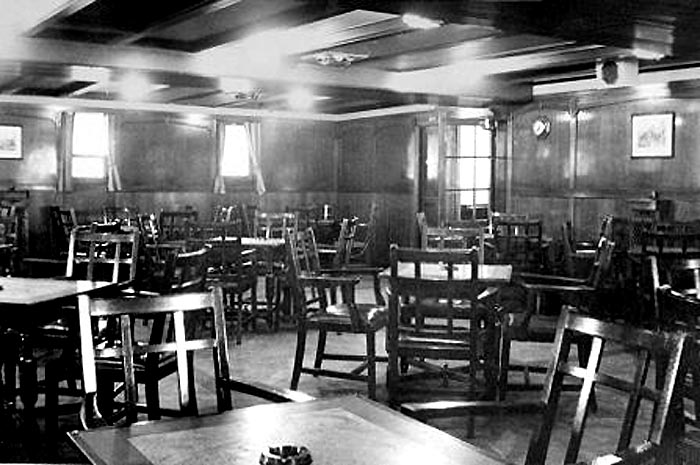 The Dining Saloon was superbly panelled in an Oak panelling and fittings and the double portholes had screens to cover them in the evening. The majority of tables were for four, but there were a few for six and some for two. The floor had a non-slip corking finish that looked a little a lino, but it was not, it was of a far superior grade. It did have a large square pattern on it.