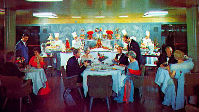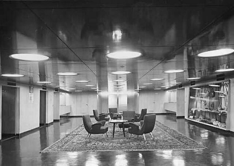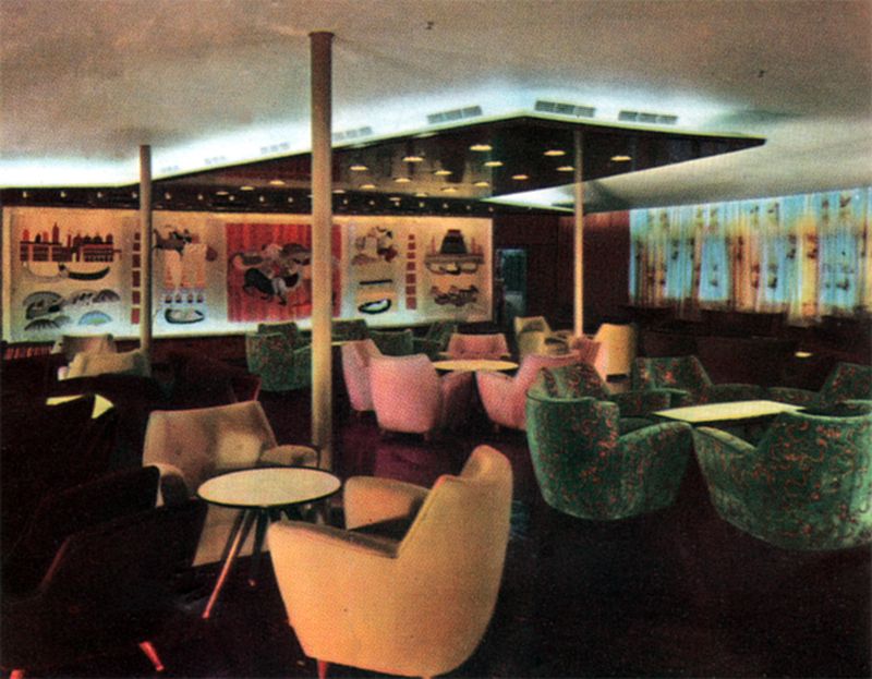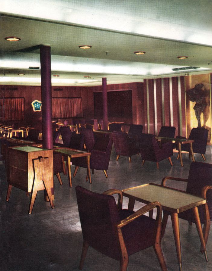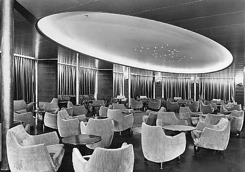 However, the sad news was that the magnificent First Class Grand Social Hall was virtually ripped out during this renovation and it became an auditorium. The only part of the original venue that survived the destruction was the elegant oval ceiling recess complete with the constellation lighting. Her cabins and other lounger were all somewhat updated and modernised and when completed she returned to her regular duties on the South American service.