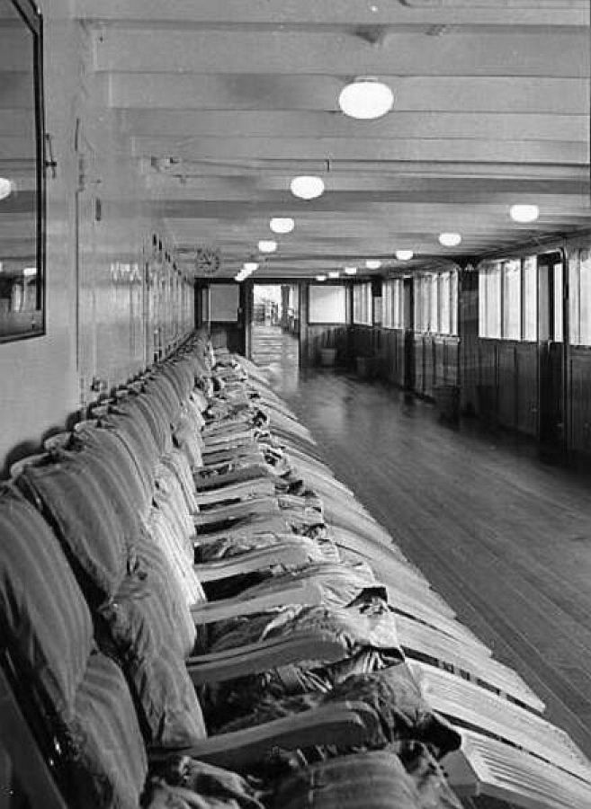 Sun Deck, commencing forward is the Bridge followed by the chartroom, radio room, then near the funnel are the kennels as well as the famous “Robot” ventilator a little further aft. This area was all first class deck space.