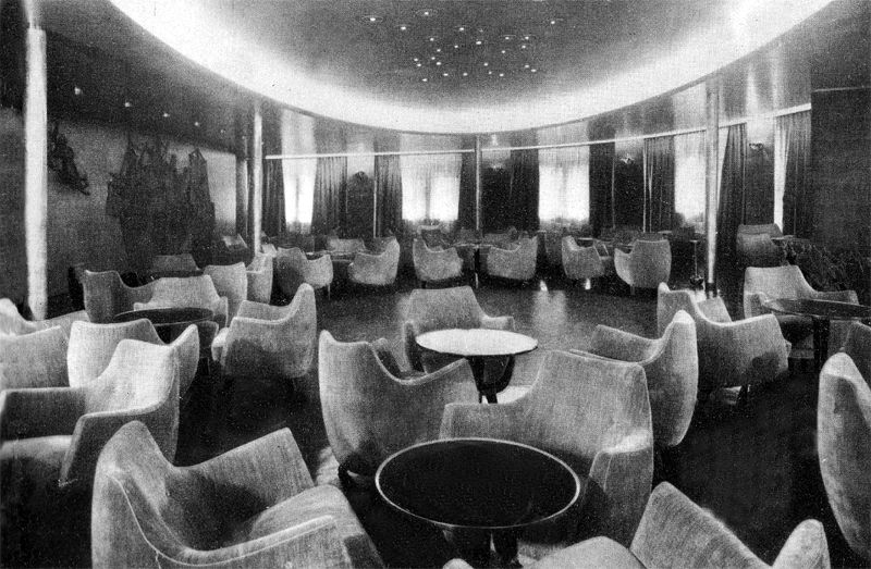 Promenade Deck, commencing forward was one of the grandest of the First Class venues, but of course there is always the delightful glass enclosed First Class Promenade to look forward to. But inside, it all commenced with the magnificent and graceful Social Hall with its superbly curved panorama of windows and an aft bulkhead that highlighted sculptures and reliefs in bronze by Italian master artist “Mascherini.” In this salon, the ceiling accommodated an oval recess where the lighting was designed in a zodiac fashion. The forward stairwell and its lobby were decorated with sculptures by Mascherini, who had a major influence in the Social Hall!