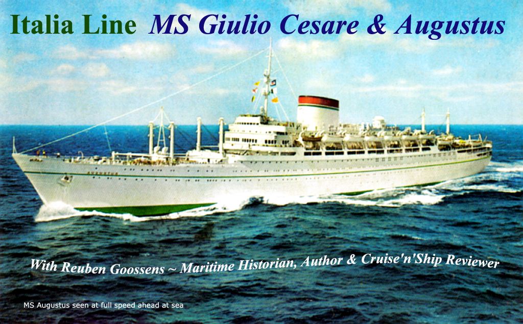 After the end of World War II, the Italian Line lost many of their fleet including their two of their finest and most luxurious liners, such as the grand 51,062 ton SS Rex and the superb 48,502 ton SS Conte di Savoia, thus the Company quickly commenced to plan to build two revolutionary new 27,000 GRT liners to replace their lost ships. The two ships designs chosen that would become the MS Giulio Cesare and Augustus were to become the impression of power and of great beauty, being ships that had superbly rounded bows, beautifully curved superstructures, no mainmasts but just six kingposts and a slender tall radar mast atop their Bridge. In addition there was a rather large stately looking funnel, and a graceful stern. Although there were also a few strange and evocative items, such as the nape the aft of the funnel base, and that strange looking tall trademark “ventilator” located further aft of the funnel, that was given the nickname “Robot” due to its strange shape and the top looked like a robot’s head – see the photo above and it is quite clear.