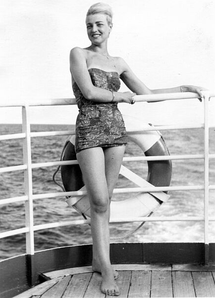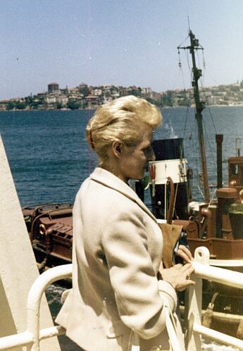 The blond Jacoba Ris-Török is seen standing at the railing astern of the ship