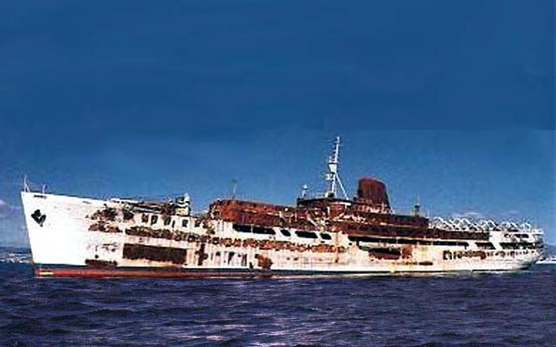 looking MV Romantica having been completely burnt out is ready to be towed to