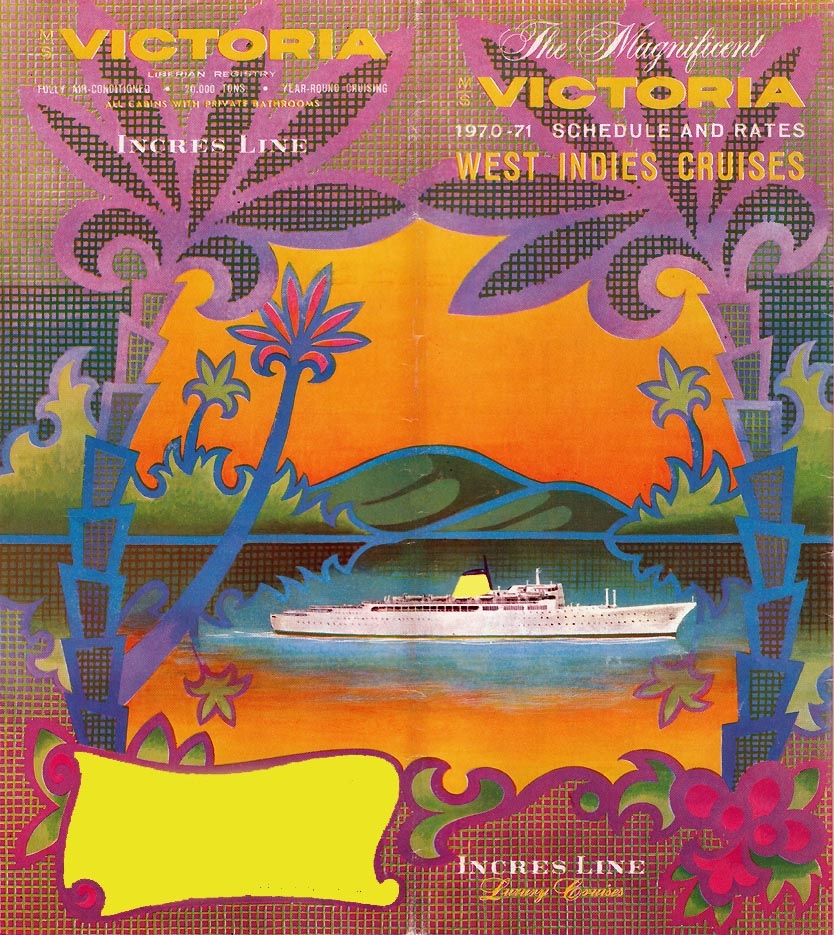 Although I have had this plan for a long time, but it has taken me this long to get around to scan this October 1971 release MS Victorias brochure of her 1972 Spring Cruises of the Mediterranean and Europe. See the brochure cover below.