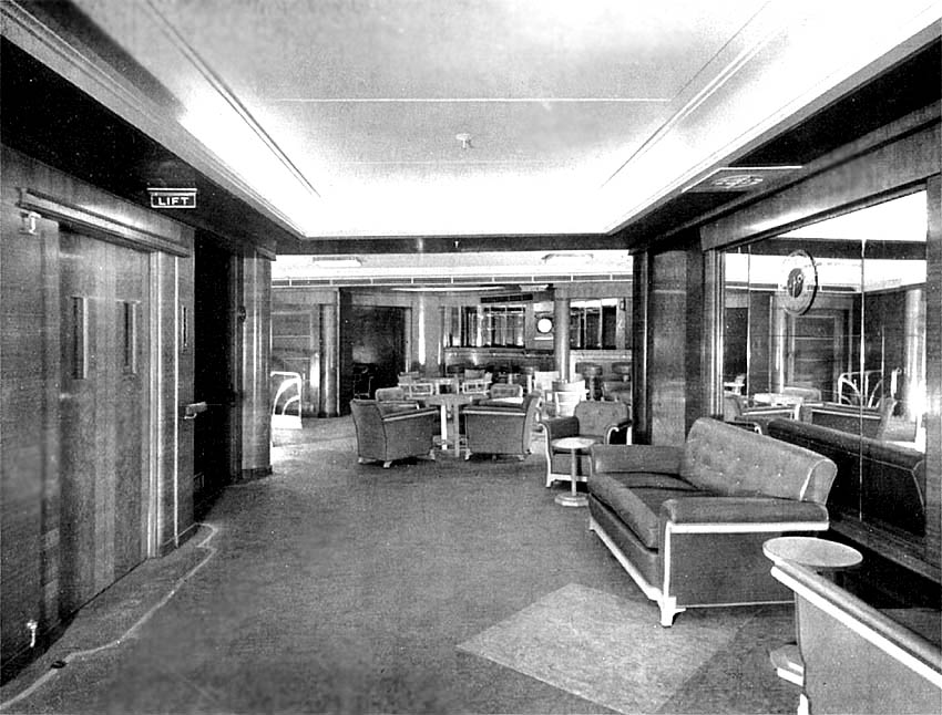 The Foyer on C Deck was more of the heart of the ship, rather than just where you boarded and left the ship when in ports. In fact this spacious entrance to this grand liner that did feature a grand staircase with a beautifully ornate metal balustrade and glass panels leading to the decks above. However, there was also the lift complete with an attendant who would take you to any of the five main decks, except the top deck Games Deck.