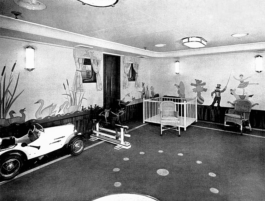 T the Dominion Monarch had three main stairwells, forward, amidships and the aft stairwell, the children’s facilities was located somewhat further aft from the aft stairwell on the port side. There was as spacious safe deck space for them to play in alongside their Playroom. The Playroom had the wall beautifully decorated, with a timber fence painted along the bottom of the wall that wend around the venue, thus it was just like if you were in your own garden. Above the fence there were plants and humorous figures and animals taken from much loved nursery books. Then there was a range of items for the young ones to play with, be it that car or one of the other items available or the organised games, either here or somewhere on the ship! It was always an adventure on the great DM for the young passengers!