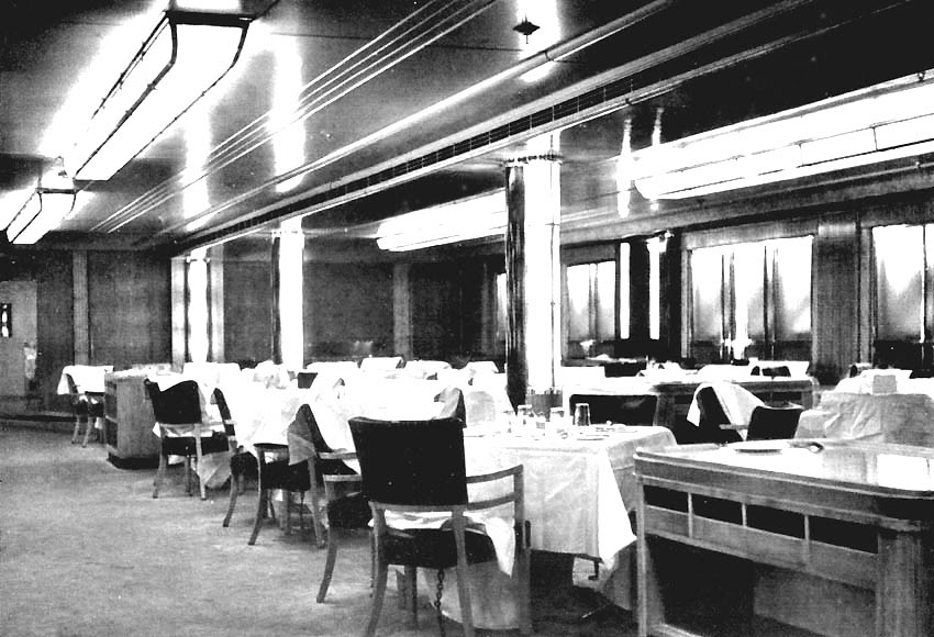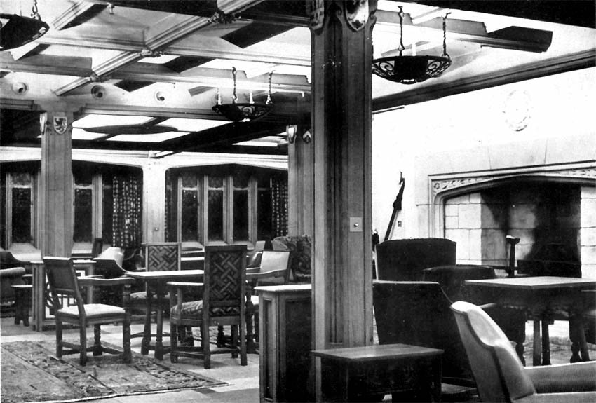 The ceiling was made of oak beamed with painted panes at the port and starboard sides. Electric light fitting also was unique as they were of hand crafted wrought steel. There were four ceiling fittings each incorporate three shields, and there were also a number of candelabra wall fittings.