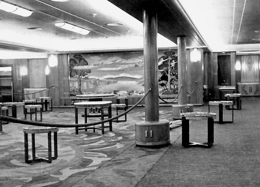 The Dining Room was certainly of generous proportions as it extended the full width of the ship and it seated up to 300 guests in great comfort. There was ample lighting as well as portholes that made the venue bright during the day and romantic at night, but the venue always felt spacious. The center portion of the ceiling was raised to form a coved dome, illuminated with concealed cornice lighting. As guests walked in to this venue, the very first thing they would see is the huge piece of artwork, being the focal point of this room! This feature was created by the artist Mrs. Pinter Davis and it is executed in metal foil on a background of selected Walnut. In the middle there are two beautifully moulded figures of a man and a woman, the woman holding in her right hand a bunch of English flowers and the man is holding flowers from sub-tropical countries. The panelling in the room is in Prima Vera, being a golden tone wood that was used mostly as simple treatment to form a better and a stronger statement for the furnishings and other decorative features in the room. The comfortable armchairs were all in Sycamore and upholstered in fine leather. The tabled are arranged for two, four or eight persons. The columns were sheathed in walnut root and flanked with engraved glass pylons extending from the floor to ceiling. The Cold Buffet was 5.2m - 17ft long and was topped with golden Quartzite tiles. The Restaurant life the Main Foyer was fully Air-Conditioned for the passenger’s comfort, thus it was no wonder that the bar in the foyer was so popular, especially when the ship was in the tropics!