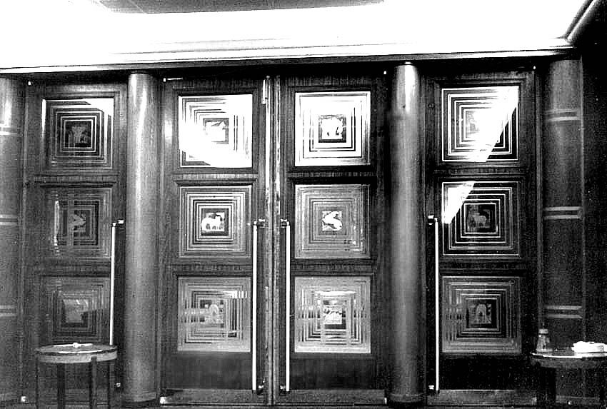 Passengers may reach this level either via the stairs or the attended lift and they would have been greeted by a well-lit Lobby as it had large windows looking out forward down to the number three hatch and the Bridge and officer’s accommodation superstructure, which gave the Dominion Monarch such a unique appearance. However as they looked aft towards the Lounge, passengers were greeted by four splendid doors. Each door contained three sand blasted glass panels, with motifs of animal life from the various countries the ship visited, thus the doors ensured a grand entrance for the somewhat understated, but luxurious Lounge that that proved to be; “Ever so British!”