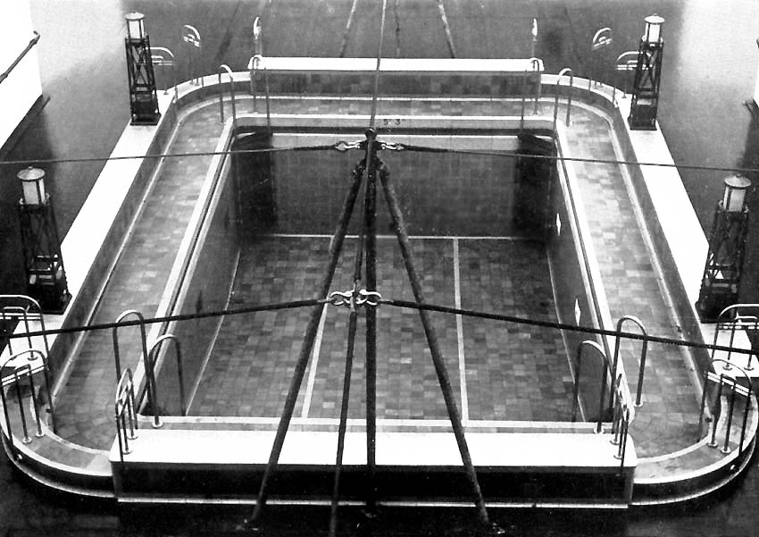 As we head far aft we arrive at the ships 7m - 24ft x 5.18m - 16ft Swimming Pool. The pool floor was lined with golden Quartzite tiles, which colour and texture looked almost like sand, but with the concealed underwater lighting, the pool looked simply amazing at night. The rest of the pool and surround was tiled in blue and yellow and surrounding the pool stood four Bronze Standards, each supporting a lantern. There were male and female dressing rooms as well as teak tables and chairs around the pool area and on deck.