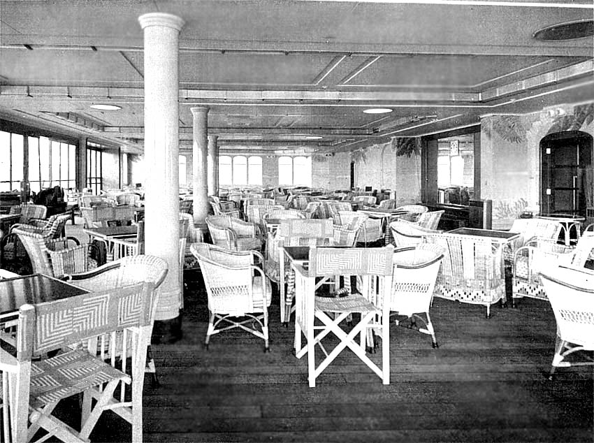 For protection against the rays of the sun whilst in the tropics canvas awnings were placed at a suitable height covering the entire deck, as well as see trough side screen to protect guests from cross winds. We need to remember that this was an all First Class luxury Liner!