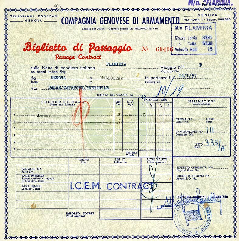 Accommodation for me was in a dormitory, having bunk beds (berths). There must have been about 25 or 30 men in the room. Toilet and shower facilities were shared. The ship could not have sufficient size fresh water tanks as on the longer legs of the journey, on 2 occasions, they supplied sea water to the showers. Cabins were given to families. They were nothing like the cabins on today’s modern cruiser ships. For they also had share bathrooms. But then again, this was a migrant ship and not a luxury liner! My ticket was arranged by an UN organisation, called I.C.E.M., as we were considered as refugees, whist the Italians sailed on what was called the “Australian Italian Assisted Passage Scheme.”