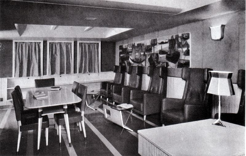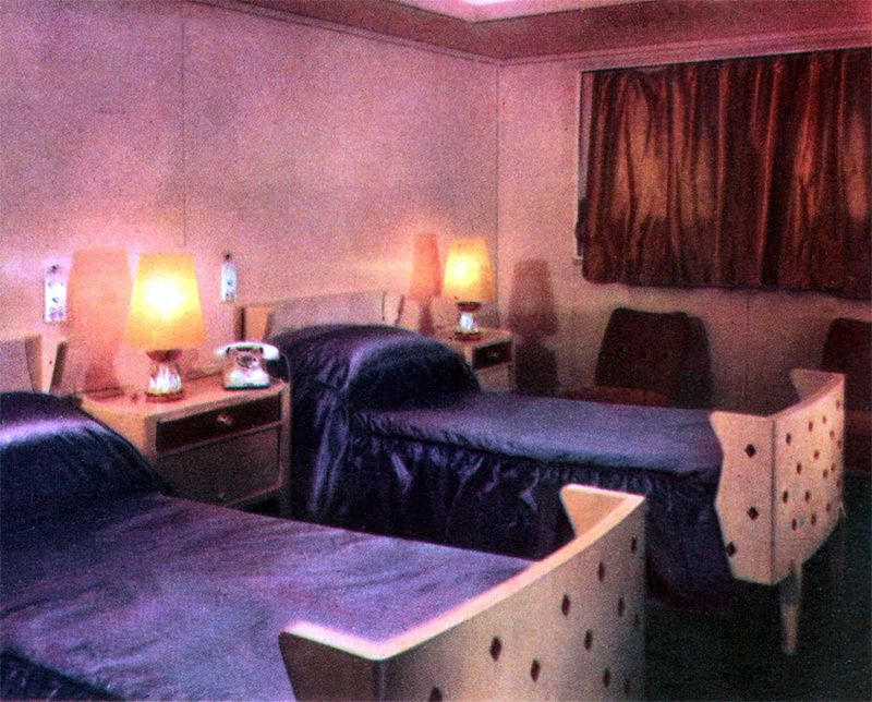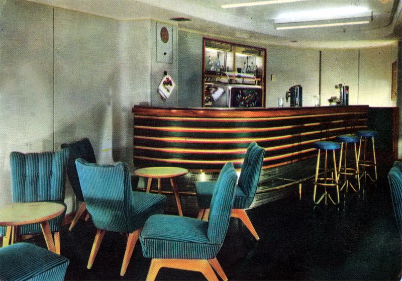 She had a vast range of accommodation available. First Class offered a great deal of passenger space as possible that was well achieved in the ships public rooms as well as her staterooms. She offered four elegant deluxe suites complete with private lounges and spacious bathrooms, each having every possible comfort imaginable. Other accommodations were either single bedded rooms or two bedded all with ocean views, and all having private facilities and a telephone! Cabin Class offered from single, two beds, to four berth cabins. All had private facilities as well as a telephone, and remember phones in cabins were rather new on board ships and a novelty in those days. Whilst Tourist Class offered from two, four to six berth cabins as well as some dormitories for migrants. There were no phones in Tourist cabins and all cabins and dormitories had shared facilities.
