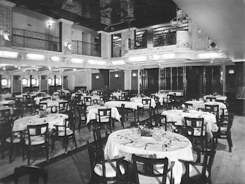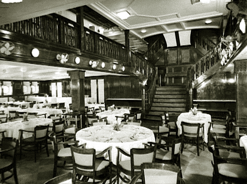 Although the two main Dining Rooms were located on F deck, but both First and Second Class Dining Rooms were blessed with grand staircases as well as bandstands in addition to being two levels high. Their balustrades were up on E Deck and those who would walk to their cabins along both sides could look down into the Dinning Room with its elaborate décor!