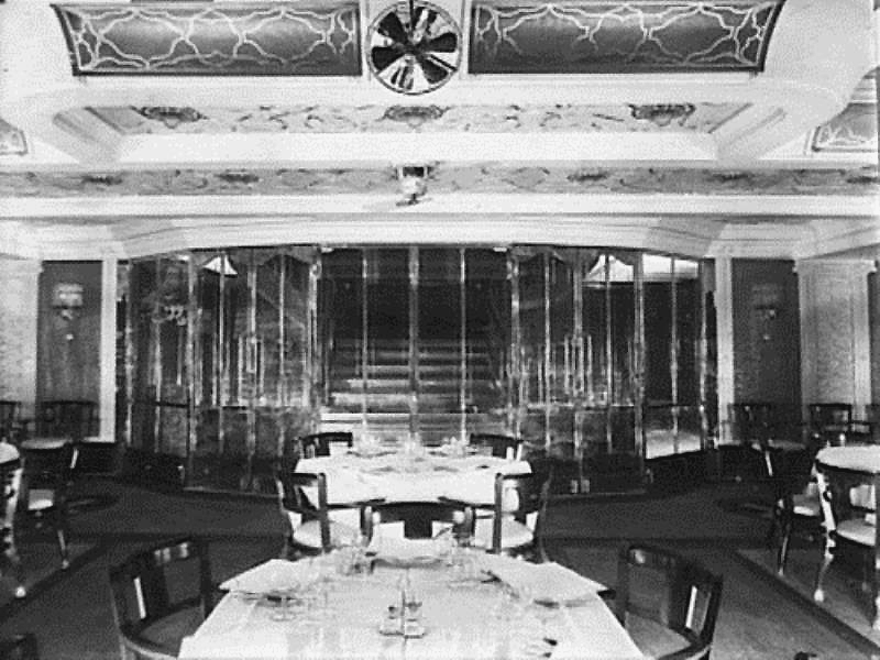 When it came to Lion Cachet’s design, the First Class Dinning Room was another of his masterpieces as there was so much detail integrated into this one venue. Starting at the upper level, we note that the ceiling was similar to the Social Hall, being made of red beaten copper, whilst the slightly off white columns were beautifully carved with detail and was perfectly enhanced for in between there was that delicate iron balustrade. Then at the bottom of each column was that wonderful hippos head looking up serving as a light. Running along the bottom of the upper level of the opening we note that it was curved inwards and it long glass panelled lights completely surrounded the venue, but these were separated by electric fans and these were necessary to keep passengers cool as fans were to be found everywhere!
