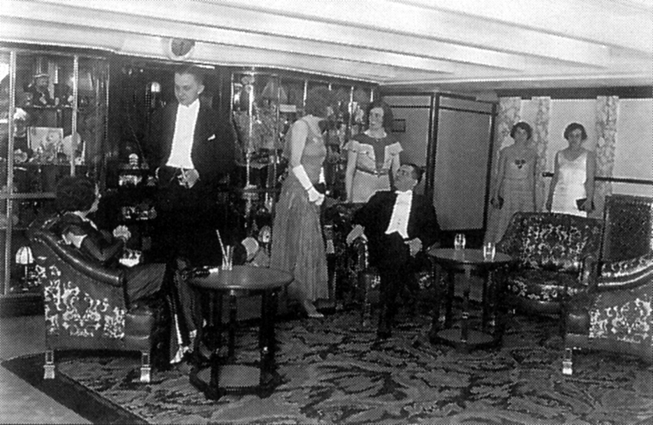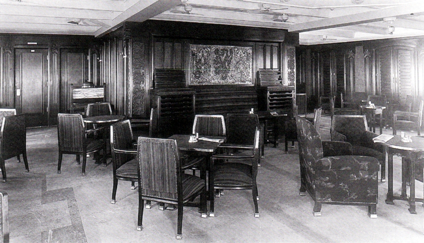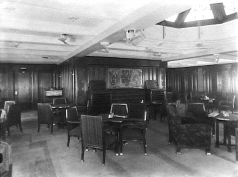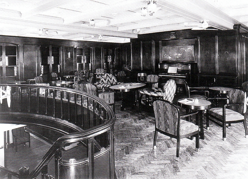 Next was the wonderfully appointed Smoking Room with the service bar aft on the portside. This venue did feature further panels with wonderful carvings. Two were located on the aft mid wall placed at each side as in the middle was another delightful piece of art as well as several large cabinets made of ebony. Along the walls, there were other panels between the windows that also had timber coverings. In the ceiling there was an octagon stained glass dome that let in light from the open (B) deck above. However, sadly that was removed for her next stage whilst she was taken during her war duties, and it was never replaced!