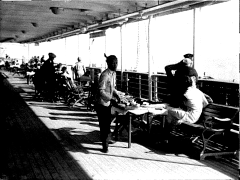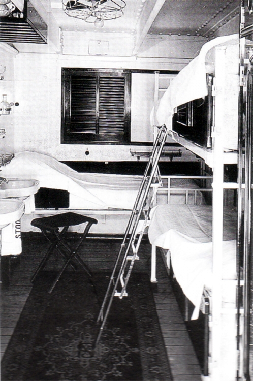 Third Class aft of D Deck there was the spacious Third Class Promenade deck considering there were only 64 passengers, but what was unusual that there were four cabins located on the port side as well as two on the starboard side, which were only accessible from the outside deck. Passengers had to enter an external door and there was a short hallway with just two doors to two cabins. These cabins were either two or four berth and toilets and a bathroom was located on the starboard side and these were also reached from the deck. Aft of the accommodations was a pleasant Smoking Room with a stairwell heading down to further accommodations.