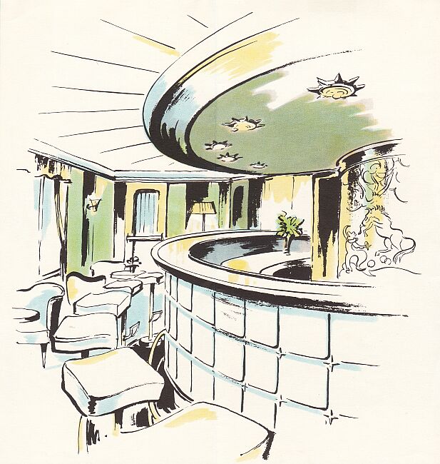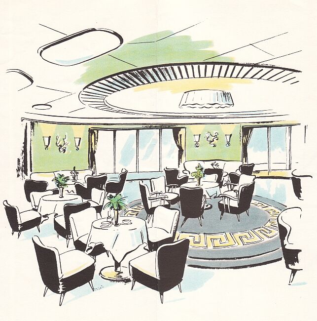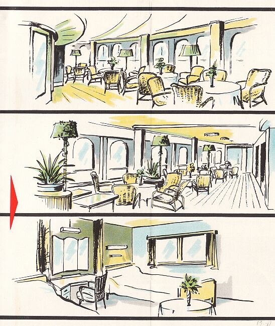 This page contains a delightful 1960 deck plan distributed by Royal Interocean Lines in 1960. It only contains artists impressions of her facilities, as well as her cabin plan and her First Class public facilities. Sadly it does not show the Second Class lounges, etc. In 1962 and 1963 both ships were extensively renovated and were fully ait-conditioned and more cabins received private facilities. In addition a new Tourist Class Lounge was built on the starboard side of Promenade Deck the Verandah Lounge, the smaller equivalent of the First Class Wintergarden. It certainly made these delightful ships even better that they already were!